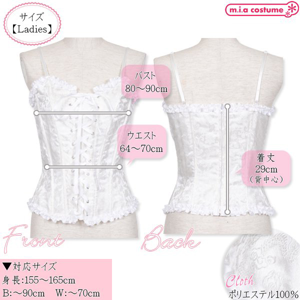フリーサイズ:B80〜90cm・W64〜70cm・着丈29cm セット内容:コルセット単品(裏地なし、背面ファスナー) 素材:ポリエステル100% 対応サイズ:身長155〜165cm・B〜90cm・W〜70cm |