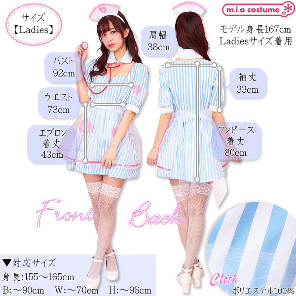 対応サイズ:身長155〜165cm・B〜90cm・W〜70cm・H〜96cm 実寸:B92cm・W73cm・肩幅38cm・袖丈33cm・着丈80cm、エプロン丈43cm セット内容:カチューシャ、付け襟、ワンピース(背中心ファスナー)、エプロン、腕章、聴診器 素材:ポリエステル100% |