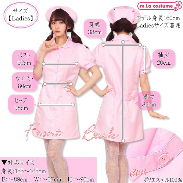 | プチプラ価格でハイクオリティなコスプレの人気シリーズ「トキメキグラフィティ」から桃色ナースグラフィティが新登場!ベーシックなデザインながらも着心地や着用時のシルエットなど随所にこだわりが詰まったワンランク上のナースコスプレです♪ピンクカラーがキュートなナースコスチューム。 丸い襟とパフスリーブがポイントで、ナースキャップは程良い位置にかぶってヘアピンで留めてくださいね♪ ※水洗い不可、塩素系漂白剤による漂白不可、アイロンは中温で当て布使用、ドライクリーニング可 |