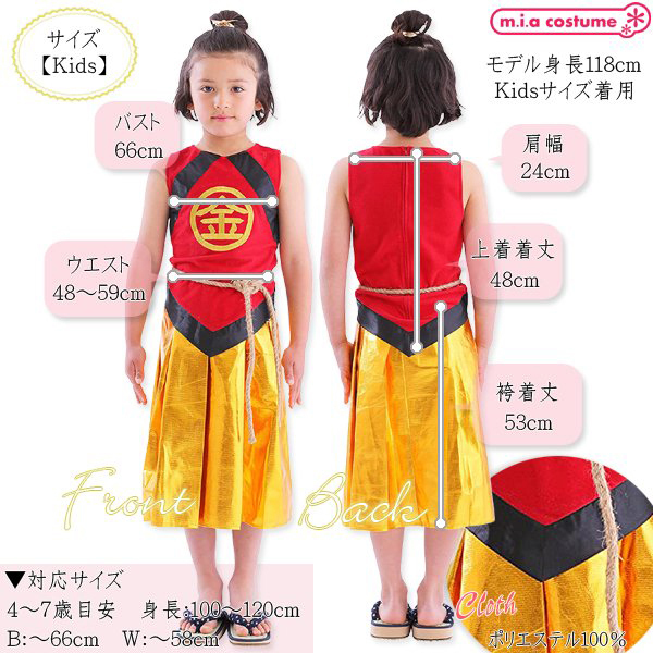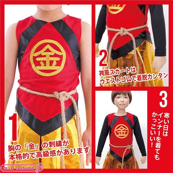 | ありそうでなかった金太郎のコスチュームです♪胸の部分の「金」の刺繍が本格的で高級感があります!袴風スカートはウエストゴムで着脱も簡単♪寒い日はインナーを着用し、ベスト風に着てもかっこいいですよ。 ※洗濯不可、塩素系漂白剤による漂白不可、アイロン不可、ドライクリーニング不可 |