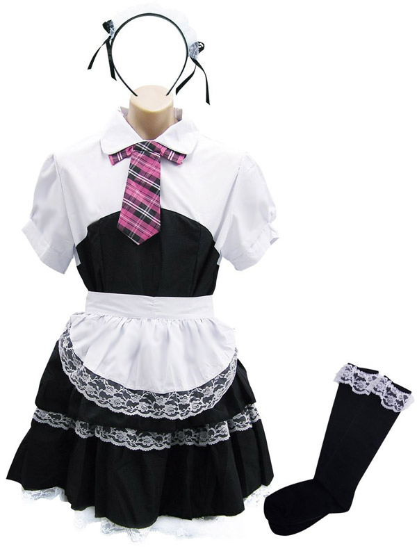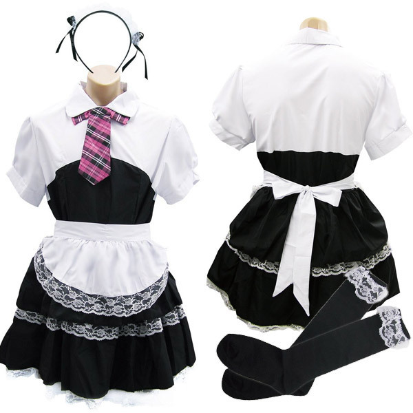 | 男の娘待望、メンズフリーサイズ!桃色ネクタイが超可愛い、メイド服コスチューム。 レース飾りがお洒落なシャツ一体型ワンピース、フリルエプロン、チェックのネクタイ、サイドリボン付きカチューシャ、黒ハイソックスの豪華5点セット!憧れのメイドさんになれちゃう、セクシーコスチュームです。 |