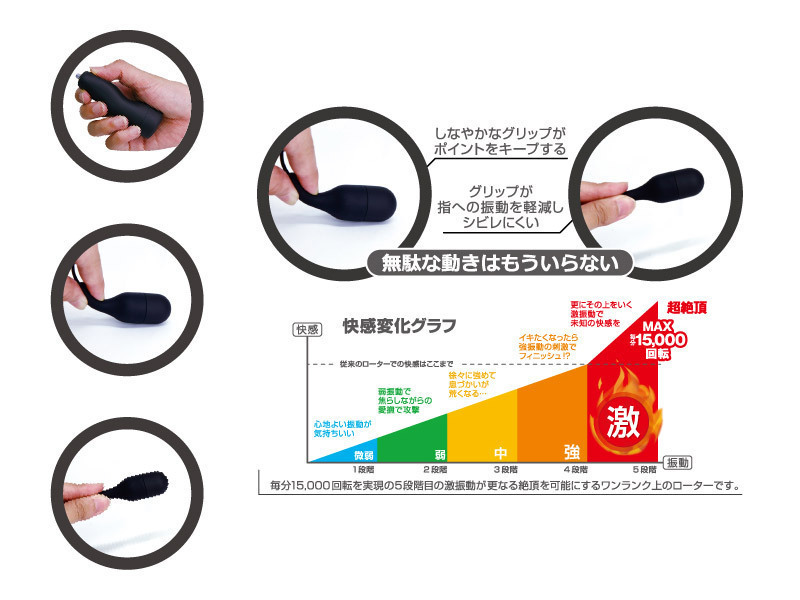 | 毎分15000回転が生み出す激しい絶頂感!最上級即逝きモード『激』搭載シングルローター。 微弱から、ボタン送りで5段階の振動調節が可能!強の上を行く強烈バイブレーションが楽しめる有線リモコンローターです。 振動で痺れにくいツマミグリップが使いやすい!マットなシリコン素材の柔軟性を生かして、当てたい場所を楽に刺激できます。 単四電池2個付き。 |