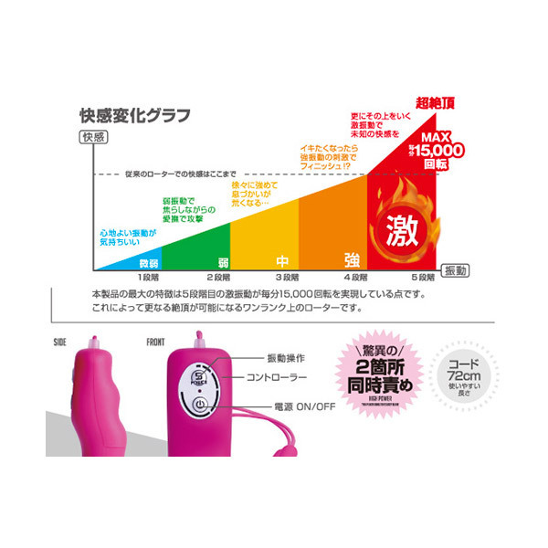 | MAX15000回転!驚異の高速回転が敏感な箇所を容赦なく責める、究極のダブルローター「ビブラル ツイン ピンク」(生活防水仕様)です。 ボタンひとつで選べる、ハイパワーな5種類の振動を搭載!また、ローター部分は強力振動を与えても痺れにくいシリコングリップ付きなので安心して使用できます。 シンプルな見た目からは想像つかないほどの刺激&快感を与えるアイテムです。 単四電池×2本使用。 |