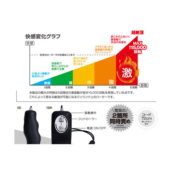 | 二ヶ所同時責めで一気に昇天!MAX15000回転の超絶振動「激」モードを搭載したダブルローターのビブラル。 振動部に付いたシリコングリップを持って操作すれば、激しい振動でも手が痺れにくいので長時間の使用が可能。 強弱調節は5段階!機能・操作共にシンプルですので、初心者の方でも安心!生活防水・静音設計のパーフェクトローターです。 単四電池×2本付属。 |
