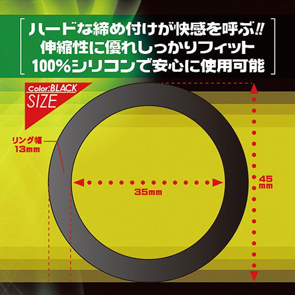 | リングの厚み13mm!ハード系シリコンでギュッと締め付ける、シンプルなブラックコックリング。 竿と玉袋を通してペニスの根元から締め付ける!φ35mmの内径、適度な伸縮性を持ち、様々なムスコにフィットしてくれます。 パートナーとのセックスやオナホールを使った自慰にて使ってみてください!硬く勃起したペニスは、いつもより感じやすくタフになっているはずです。 |
