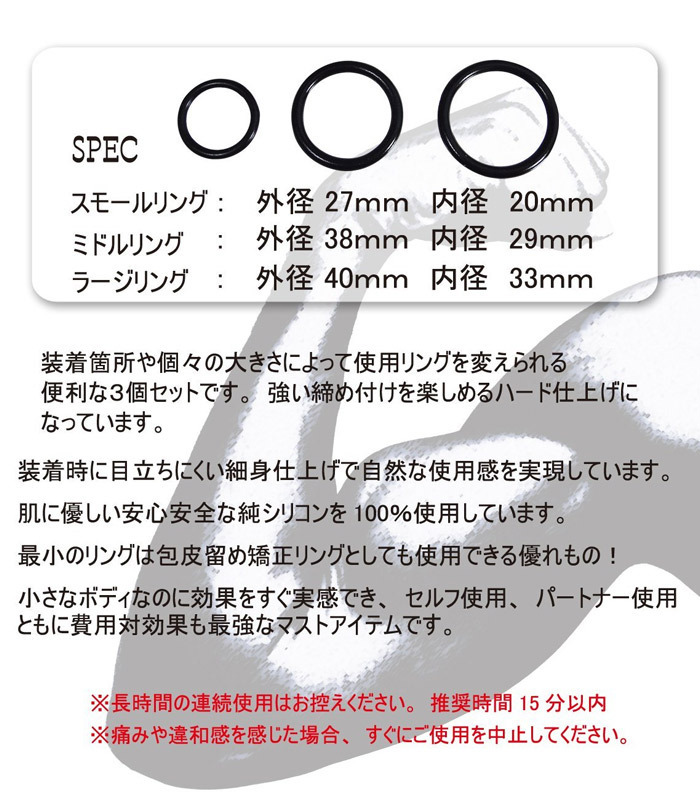 | 使い方自由自在!ギュギュッと男力をアゲるハードなコックリングセット。 ●締め付け強めのハードタイプ●安全なピュアシリコン100%製●細身リングで自然な見た目に●大きさの異なる3サイズセット●根元・先端…3本全装備も可能●スモールは包皮固定用にも◎。 ひとりの時でもカップルでの使用にも役立つコックリング。 1本だけ・2本まとめて・3本全部など、付け方もあなた次第!ただし無理な使用や長時間装着は痛みの原因となりますので、15分程度を目安に外すよう心がけてください。 ※痛みや違和感を感じた場合、すぐにご使用を中止してください。 |