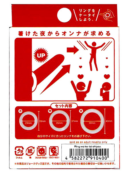 | 大・中・小の3個入り!シリコン素材のソフトリングセット「リングをケータイしよう」。 ●純正シリコン素材のリング3個●小サイズ:外径33mm・内径23mm●中サイズ:外径37mm・内径26mm●大サイズ:外径43mm・内径30mm。 勃起力UPや早漏防止に!サイズやお好みに応じて3サイズを使い分けられる純正シリコン素材のソフトリング3サイズセット。 カリ首や根元などお好きな部位に装着することで、様々な刺激を楽しめる男性用補助グッズです。 |