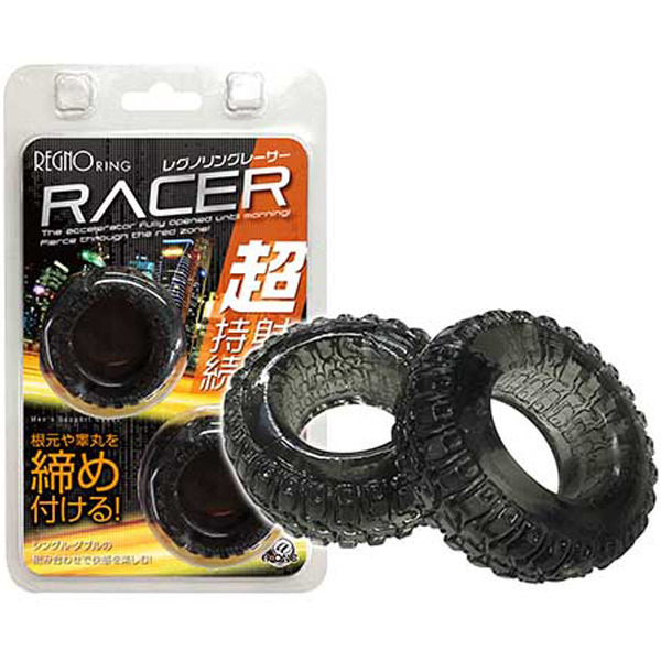| Wリングで夜を駆け抜けろ!持続力×射精力×勃起力をサポートするペニスリング2個セット「レグノリング レーサー」。 ●タイヤ風のブラックリング×2個●本体3.8×1.5cm・内径2.1cm●シングルorダブル使いも可能。 装着の仕方次第で様々な効果を発揮!厚みのあるタイヤ形状のダブルリングで根元や睾丸をガッツリ締め付ける男性用補助グッズです。 |