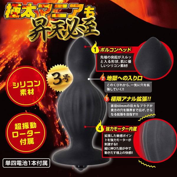 | 昇天必至の超強力ローター搭載!強烈な刺激が癖になる電動アナルプラグ「ボルコン3号」。 二段の膨らみを持つくびれボディはシリコン素材で滑らかな肌触り!表面には縦に伸びるストレート筋を入れて刺激をプラス。 スルッと入る先端ボルコンヘッドの先にあるくびれを超えると、二つ目の大きな膨らみが腸内を限界まで広げます。 さらに、拡張した敏感ポイントに強力振動ローターが刺激を与える悶絶必至のアナル拡張グッズ。 上級者向けサイズの3号は全長15cm、最大径6cmとメガトン級の超巨大仕様です。 単四電池×1本付属。 |
