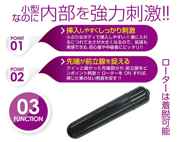 | 小ぶりでも超パワフル!挿入しやすいミニタイプの電動エネマグラ「プロクトミニ ジェット」。 アナルプラグのようなストッパー付きの本体は先端が前立腺をしっかり捉えるジャスト形状!クビレ部分が抜け落ちを防ぎつつ、クイッと曲がった先端部分が前立腺に直撃!ピンポイントでしっかり捉えて内部を強力に刺激します。 根元にいくにつれて太くなるフォルムは拡張も実感できるので初心者や中級者にもピッタリ。 さらに、3ファンクション搭載の内蔵ローターONで悶絶刺激も味わえます。 ローターは着脱可能!単四電池×1本付属。 電池を入れる際、中の絶縁体シートは外さないでください。 |