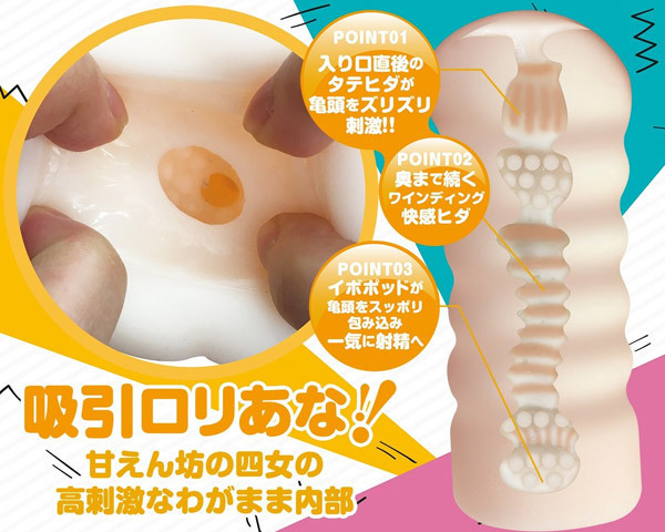 | スケベ四姉妹と中出しSEX!甘えん坊四女アオイの高刺激オナホール「おなシスタ04 碧(AOI)」。 『おなガール』の血を受け継いだ新シリーズ『おなシスタ』が登場!入り口直後の縦ヒダが亀頭をズリズリ刺激!奥まで続く快感ワインディングヒダを抜けた後は、イボポッドが亀頭をスッポリ包み込んで一気に射精へと誘います。 |