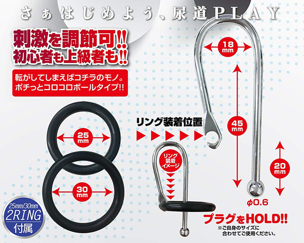 | U字型に加工されたステンレス製の尿道プラグです。 ショートサイズだから使い勝手が良く、先端部分のボールが尿道を刺激するタイプでリングの大きさは25mmと30mmの2サイズ♪メタル素材だから煮沸消毒ができるほか、耐久性も期待できるので、自分の好みのところへセットできたら、付属のリングでそのまま固定出来るように設計されています。 先端部分のボールは直径6mmのため、そこまで拡張はできませんが、ずっと装着していたくなる不思議な感覚が味わえます♪初心者から上級者までお楽しみ頂ける本作品。 とはいえ、尿道プレイは危険を伴う場合もありますので、使用の際は無理のない範囲でご使用ください! |