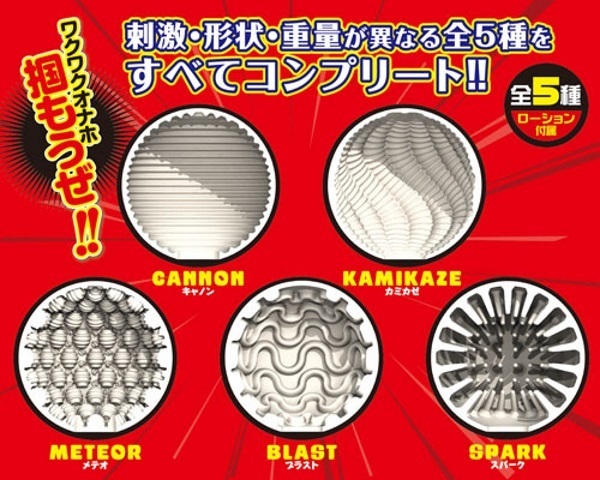 | ぶっちぎりの快感!!カプセルにオナホが入ったガチャホール。 刺激・形状・重量の異なる全5種類で登場!!【キャノン】スタンダードなねじ切りタイプ。 細かいヒダヒダが竿を刺激【カミカゼ】いくつもの細かな凹凸をトルネード上に配置【メテオ】無数のイボ突起が、流星の如く襲い掛かる【ブラスト】ウェーブ状に配置された突起が、カリ首を咥え込む。 【スパーク】ヒゲ状の突起がくすぐりながら弾けて刺激。 ディスプレイ用としても使用可能なBOXに5種×5個の計25個入った状態で発送いたします。 ガチャマシーンに入れて販売することも可能ですが、カプセルにはバーコード付きフィルムが巻かれているので店頭での販売も可能です。 |