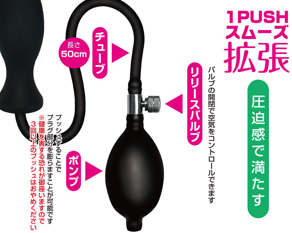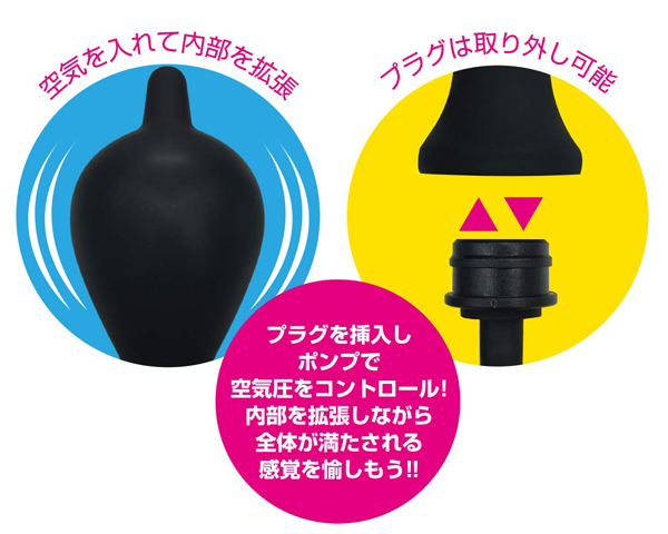 | 内部で膨らむ拡張プラグ。 プラグを挿入しポンプで空気圧をコントロール!プラグは取り外せるので、丸洗いも可能。 リッチタイプは圧迫感で中を満たす感覚がたまらない形状。 内部を拡張しながら全体が満たされる感覚を愉しもう!!・丸洗いOK・滑らかな挿入感 ※健康を害する恐れが御座いますので3回以上のプッシュはおやめください。 ※健康を害する恐れが御座いますので3回以上のプッシュはおやめください。 |