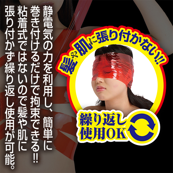 | 体中どこにでも使用OK!魔法のように吸着できるSMプレイ用拘束テープ。 ●人気の拘束具「SMart」シリーズ●扱いやすい5cm幅の赤色テープ●全身に惜しまず使える長さ15m●静電気の力による優しい密着感●粘着素材不使用なので再利用OK。 普段の生活でもなじみ深い食品用ラップフィルムのように、ピタッと静電気で密着できる拘束テープ。 ベタベタしないので髪の毛や顔、アンダーヘアにも利用OK!座らせた椅子ごとグルグル…なんていうプレイもできちゃいます。 |