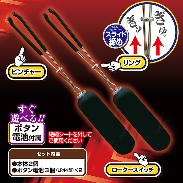 | 痛みと振動で乳首イキ!!!挟んで!震えて!重みで!乳首がビビビビン!!!アッ、乳首がとれちゃいそう…!!!!シンプルに乳首責めを楽しむアイテムです。 振動は楽しめる10パターン。 ブルブルイジメちゃおッ!!!STEP1.ピンチャーで乳首を摘み、2.リングでしっかりと締め上げ、3.ローターのスイッチをON!でプレイスタート!!!! ※ご使用の際はローターの蓋をしっかりと閉めてから電源を入れてください。 |