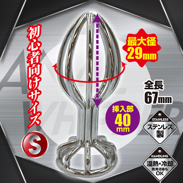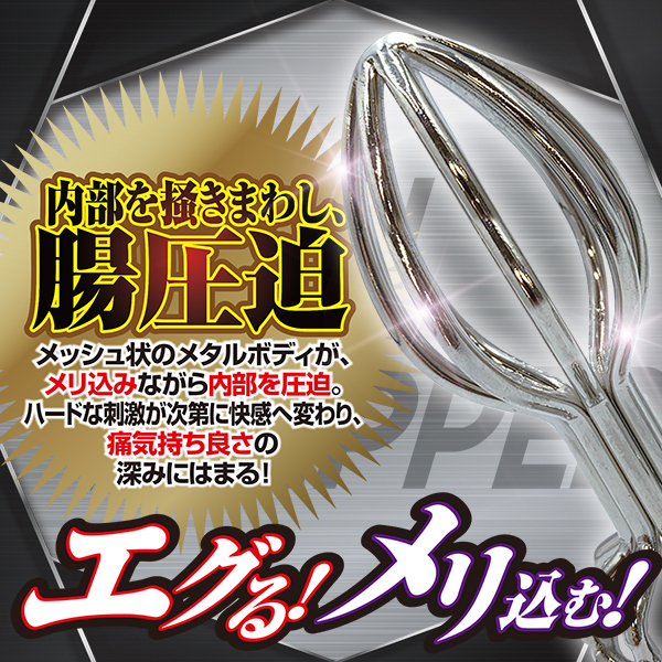 | エグる!メリ込む!内部を掻きまわし、腸圧迫!メッシュ状のメタルボディがメリ込みながら内部を圧迫。 ハードな刺激が次第に快感へ変わり痛気持ち良さの深みにハマる!プラグを挿入後、底部の穴から液体の注入も可能!ステンレス製なので温熱・冷却しての使用、煮沸消毒もOK♪使用後の洗浄もラクチン。 磨き上げられたメタルボディでハードにエグれ!!!Sサイズは初心者でも安心! |