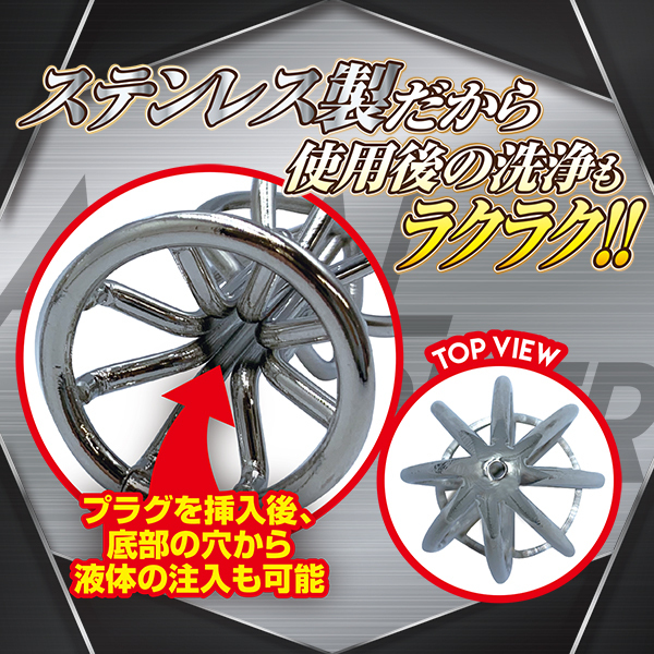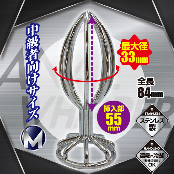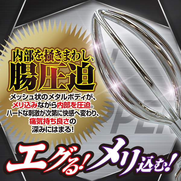 | エグる!メリ込む!内部を掻きまわし、腸圧迫!メッシュ状のメタルボディがメリ込みながら内部を圧迫。 ハードな刺激が次第に快感へ変わり痛気持ち良さの深みにハマる!プラグを挿入後、底部の穴から液体の注入も可能!ステンレス製なので温熱・冷却しての使用、煮沸消毒もOK♪使用後の洗浄もラクチン。 磨き上げられたメタルボディでハードにエグれ!!!Mサイズは中級者も納得! |