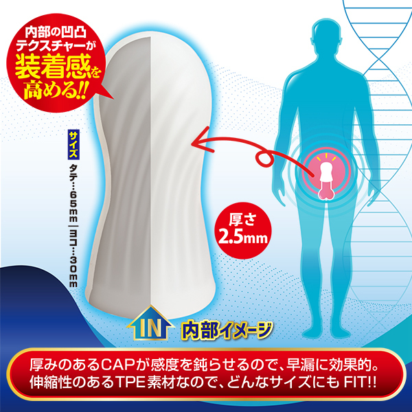 | 男の強いミカタ。 夜のお助けサポートアイテム!!厚みのあるキャップが感度を鈍らせ、持続力マシマシで長期戦もOK。 装着方法も簡単。 キャップを自身に被せ、その上からコンドームを装着するだけ。 フィット感も抜群で、どんなサイズにも対応。 いつもより長く楽しみたい方におススメのお手頃キャップです。 ●TPE素材…伸縮性抜群で、どんなサイズでもぴったりフィット |