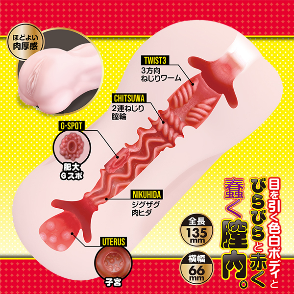 | 未熟な見た目と、早熟した膣内と。 目を引く色白ボディとびらびらと赤く蠢く膣内。 ねじれた2連の膣輪とジグザグとした肉ヒダがメリメリと亀頭・カリ・竿全体にねっとりと纏わりついてくる…。 未熟な見た目とは裏腹に、肉ヒダの波にすっぽりと飲み込み、アナタを弄ぶ。 <内部形状>●3方向ねじりワーム●2連ねじり膣輪●ジグザグ肉ヒダ●肥大Gスポ●子宮 |