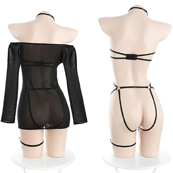 | ボディを縦横無尽に巡る、蜘蛛の巣のようなストラップ。 ネックとフロントにはメタリックなボタンがキラキラと輝きます。 これだけでもボンデージ風テディとして楽しめます。 でもこれだけじゃないんです。 メッシュの長袖Tシャツも付いて、レイヤードスタイルに。 透けるボディが、生肌よりもよりセクシーさを演出します。 片脚用のキャットガーター付き |
