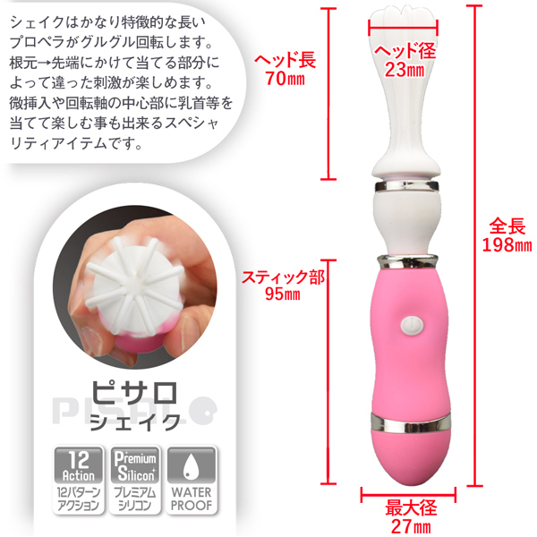 | ハンドミキサーのような形状が特徴的なアダルトグッズ。 長いプロペラ付のヘッド部分がクルクルと回転し敏感部分を刺激♪当てる部位によって異なる刺激をお楽しみいただけます。 アクションは12種類搭載!持ち手にはマットラバーを、ヘッドには柔らかな医療用シリコンを採用し長時間のプレイにも対応、メンテナンスしやすい生活防水設計。 |