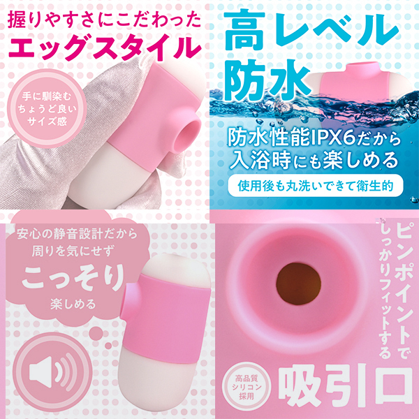 | 握りやすさにこだわったエッグスタイルの吸引ローターです♪可愛らしいタマゴ型フォルムに、高性能な静音モーターを搭載!上部に配置されたボタンで、片手でも簡単に操作が可能です♪吸引口には柔らかく高品質なシリコン素材を使用し、しっかりとフィットして快適な真空状態を実現!7パターンの吸引アクションを搭載しており、強弱の調整も自由自在です♪120分で満充電でき、最大90分の連続使用が可能!(使用環境により変動します!)さらにIPX6相当の防水設計だから、水洗いもできて清潔に保てます♪手軽さと高性能を兼ね備えた、使いやすさ抜群のアイテムです! |