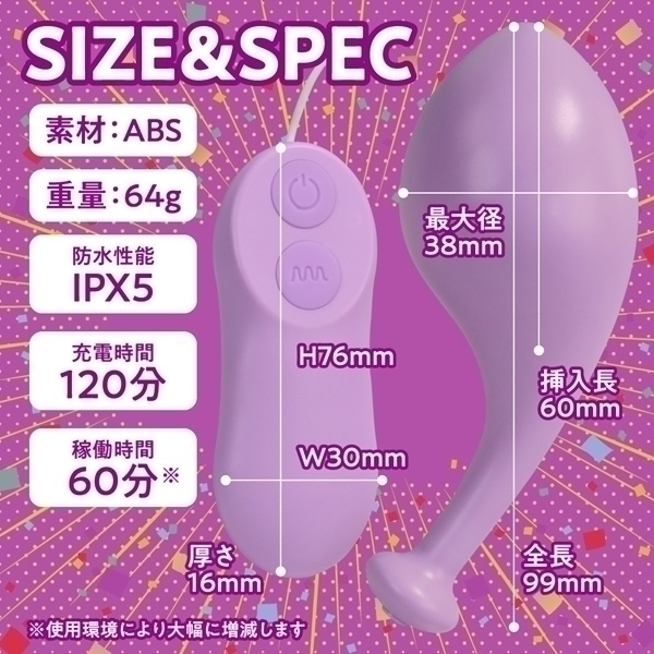 本体サイズ:コントローラー:3.0×7.6×1.6cm ローター:全長9.9cm×挿入長6.0cm 最大径3.8cm 重量:64g USB充電ケーブル USB充電式 |
