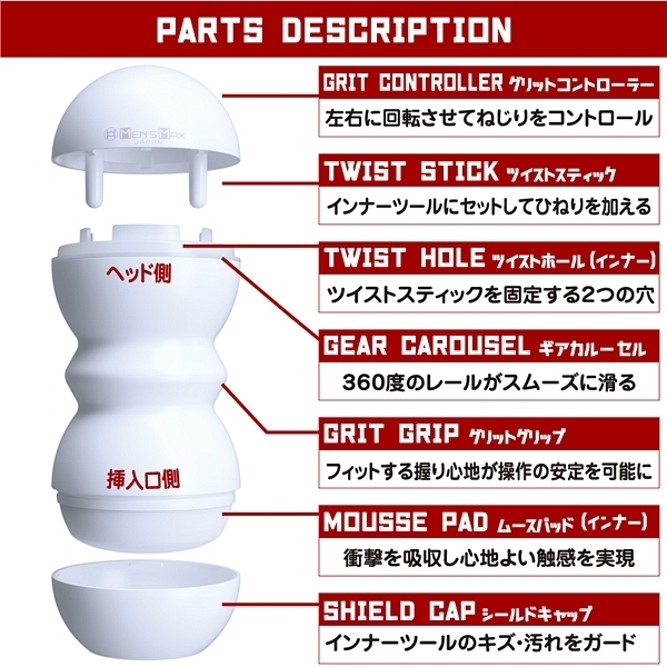| グリットコントローラーは右にも左にもツイスト可能。 右と左のひねる方向で内部構造も変化する!お好みのひねり具合で吸着感をコントロール!挿入口のキャップを外しローションを入れて挿入。 グリットコントローラーを右に左にねじって刺激の変化を体感せよ。 インナーは丸洗い可能。 各パーツを取り外し、洗浄・乾燥が終わったら組立てて再び使用可能。 アウターケースは耐久性に優れ表面のマット仕上げとフォルムで安心のグリップ感。 インナーは約250gで単体のみでの使用も可能なずっしりサイズ。 ポケットローション(7ml)付属。 グリットコントローラーに付いたスプリングボールとギアカルーセルがかみ合いスムーズな操作性を実現。 グリットコントローラーは右にも左にも回せます、右と左のひねる方向で内部構造も変化する!お好みのひねり具合で吸着感をコントロール!<内部構造>@バウンスビーズ 弾力感のある大型ビーズAボーンビーズ 背骨のように連なった縦型極小ビーズBフラップビーズ 斜めに突き出すフラップ型ビーズ |