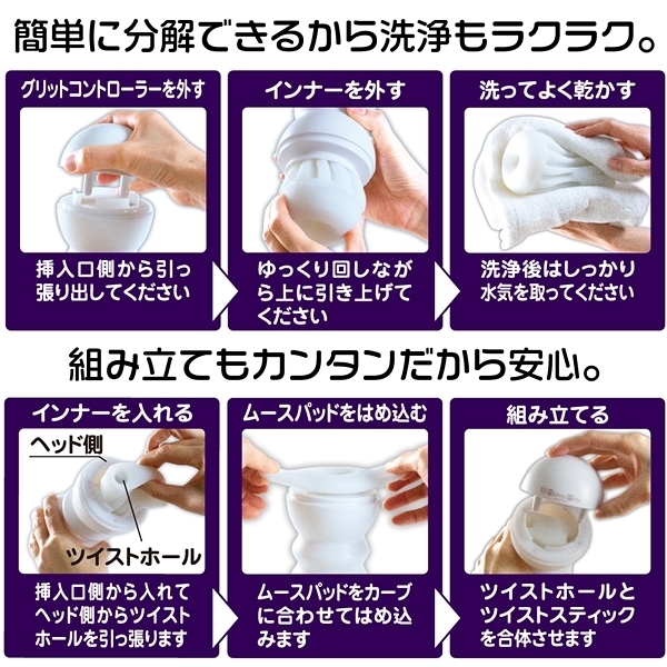 | グリットコントローラーは右にも左にもツイスト可能。 右と左のひねる方向で内部構造も変化する!お好みのひねり具合で吸着感をコントロール!挿入口のキャップを外しローションを入れて挿入。 グリットコントローラーを右に左にねじって刺激の変化を体感せよ。 インナーは丸洗い可能。 各パーツを取り外し、洗浄・乾燥が終わったら組立てて再び使用可能。 アウターケースは耐久性に優れ表面のマット仕上げとフォルムで安心のグリップ感。 インナーは約250gで単体のみでの使用も可能なずっしりサイズ。 ポケットローション(7ml)付属。 グリットコントローラーに付いたスプリングボールとギアカルーセルがかみ合いスムーズな操作性を実現。 グリットコントローラーは右にも左にも回せます、右と左のひねる方向で内部構造も変化する!お好みのひねり具合で吸着感をコントロール!<内部構造>@エッグワーム プルプルの卵型ギミックAインチワーム 小型ワームの巣窟を模したギミックBファットワーム 大型ワームギミックによる悪魔の絡みつき |