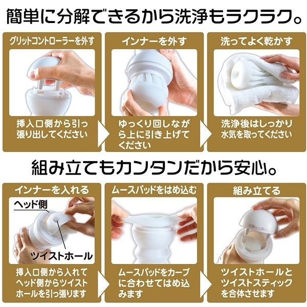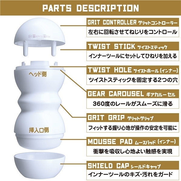 | グリットコントローラーは右にも左にもツイスト可能。 右と左のひねる方向で内部構造も変化する!お好みのひねり具合で吸着感をコントロール!挿入口のキャップを外しローションを入れて挿入。 グリットコントローラーを右に左にねじって刺激の変化を体感せよ。 インナーは丸洗い可能。 各パーツを取り外し、洗浄・乾燥が終わったら組立てて再び使用可能。 アウターケースは耐久性に優れ表面のマット仕上げとフォルムで安心のグリップ感。 インナーは約250gで単体のみでの使用も可能なずっしりサイズ。 ポケットローション(7ml)付属。 グリットコントローラーに付いたスプリングボールとギアカルーセルがかみ合いスムーズな操作性を実現。 グリットコントローラーは右にも左にも回せます、右と左のひねる方向で内部構造も変化する!お好みのひねり具合で吸着感をコントロール!<内部構造>@グラインドスクリュー 掘削機をモチーフにした最奥ゾーンAツインスクリュー 2種類の縦型スクリューで締め上げるBビッグスクリュー 肉厚なスクリューが根本をホールド |