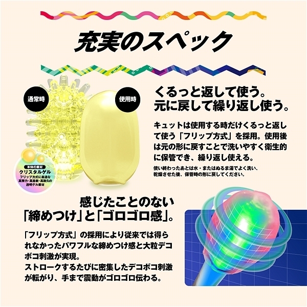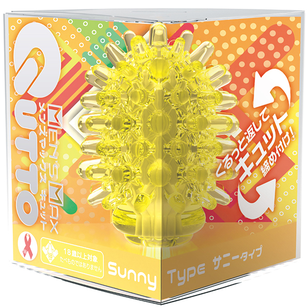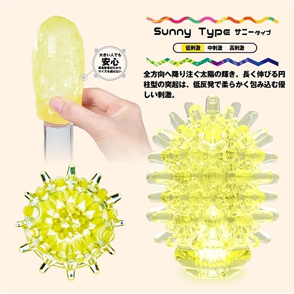 | 大粒デコボコ刺激がキュット締めつけ!裏返す事で未知なる体験と利便機能を持った変化する密集体ホール。 「Qutto−キュット−」は従来よりも突起が大きく、肉厚になった大粒のデコボコ刺激を搭載。 使用時に本体の凹凸面を内側に返すことで、内側に向かって大粒のデコボコ刺激が密集。 キュット締めつけることで、「未確認の触感」を体験することができます。 サニータイプは、全方向へ降り注ぐ太陽の輝き。 長く伸びる円柱型の突起は、低反発で柔らかく包み込む優しい刺激。 この商品には個装のローションが付属しています。 |