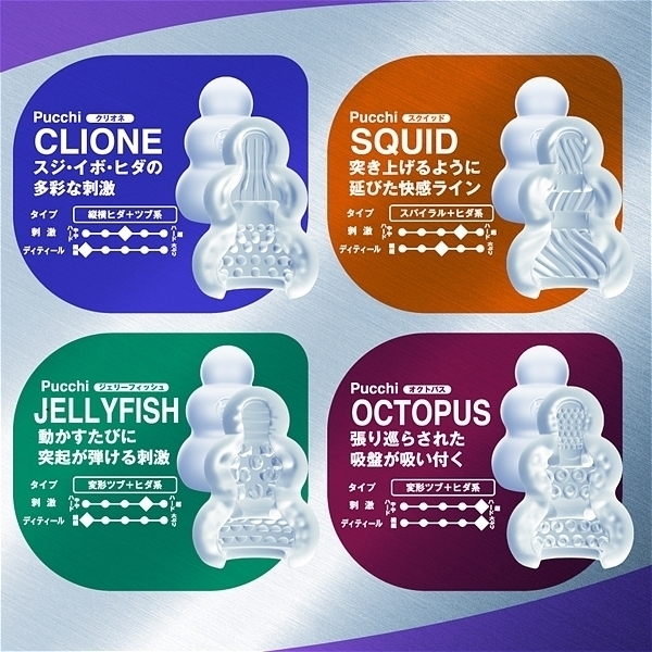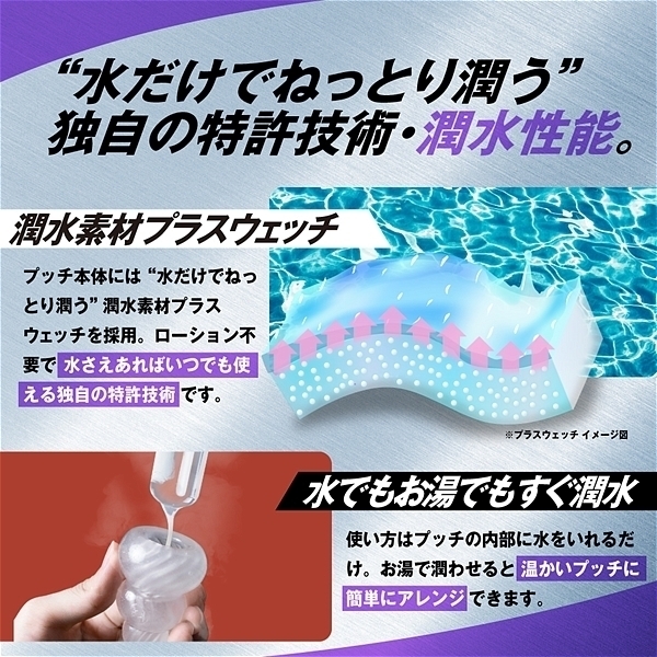 | プラスウェッチは独自開発の新素材。 水をつけて軽く擦ることで内部の超ミクロサイズで閉じ込められた「潤いゼリー」が水に反応し、沁みだし樹脂表面をねっとりと潤い包みこみます。 <デコボコ感さらにクッキリ。 >「HD(High Definition)成形」で突起のデコボコ感がさらにクッキリになりました。 突起に触れたときの粒立ちが違います。 <クリオネ内部構造>「スジ・イボ・ヒダの多彩な刺激」大ぶりの突起たちが全体を大胆に刺激する<ジェリーフィッシュ内部構造>「動かすたびに突起が弾ける刺激」長めに作られた突起が全体を弾いて刺激する<オクトパス内部構造>「張り巡らされた吸盤が吸い付く」吸盤とイボが密着し触感を生み出す<スクイッド内部構造>「突き上げるように延びた触感ライン」大きく隆起をしたスリットが奥へ奥へといざなう |