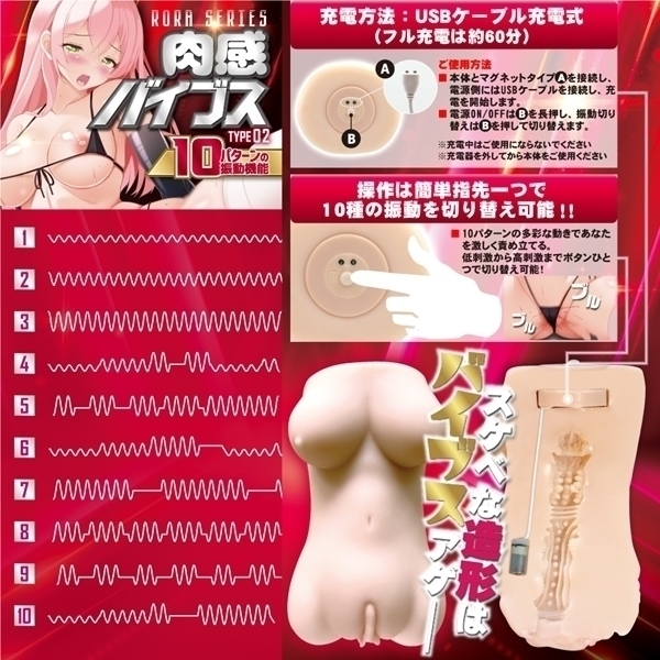| 圧倒的肉感と強力ローターのブルブル超振動!多彩な振動パターン搭載のローター内蔵ホール。 900gオーバーの肉感にローターを内蔵した大型ホール。 TYPE02はナイスバディなトルソー型。 入口から走る縦ヒダと大小のイボ・コブが、ローターの振動との相性抜群。 10パターンの振動でランダムに蠢き快感をググっと高めます。 ローターはUSBケーブルでの充電式。 接続部分はマグネット式なので洗浄の際も安心です。 見た目も内部構造も振動もすべてに抜かりなしの新感覚ホールです。 |