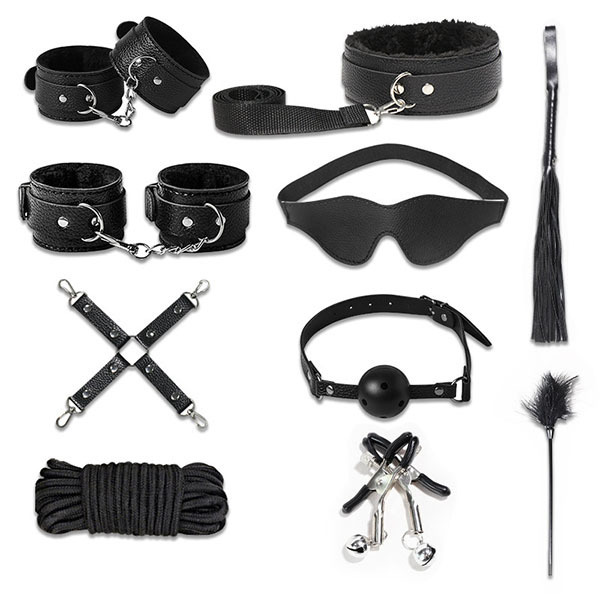 セット内容:手枷、足枷、リード付き首輪、手枷足枷十字連結、乳首枷、拘束ロープ、アイマスク、ボールギャグ、バラムチ、フェザー |