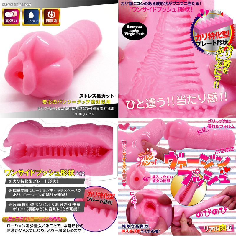 | 角度で変わる超絶快感!プレート型のヒダが乱舞する、カリ&裏スジ責めオナホール「挿入乱舞ヴァージンプッシュ」非貫通型。 本体はグリップ性の高いフォルムを採用!プルプル&コシのあるリアルなモチ肌素材が、絶妙な弾力感を生み出します。 内部は片側のみにヒダを配置したカリ特化型!ホールをくるりとまわせば、裏スジへのピンポイント刺激も可能な快感オナホールです。 |
