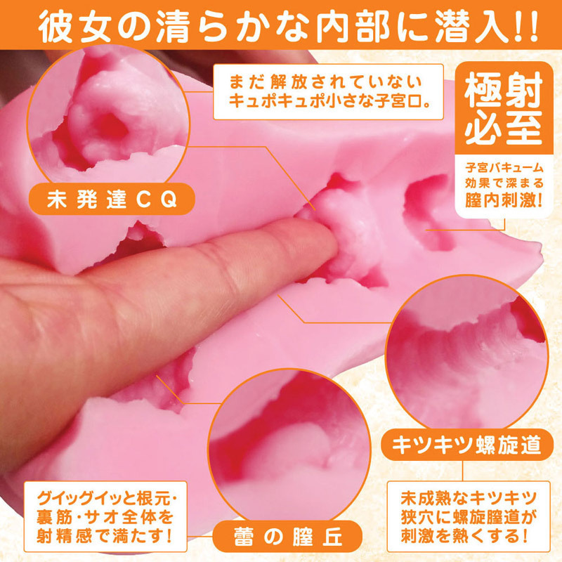 | 「ロリCQ」は、キツキツの子宮(CQ)を再現したオナホールで、キツキツのCQが好きな方におすすめです♪挿入直後に未発達の膣丘が感じられ、内部でしっかりと締めつけてくれます。 奥に進むと、未成熟なキツキツ狭穴に螺旋膣道が刺激的な快感を与えます!サイズは平均的なハンドホールと同程度で、ボリュームも300gほどの肉厚さがあり、素材はバンジータッチで、べたつきやにおいはありません♪肉厚で柔らかい弾力が特徴です。 最深部手前には小さな未解放の子宮口があり、最深部にはバキューム効果を持つエアポケットを採用!しっかりと締めつけて強力なバキュームで吸い上げてくれるため、最後の一滴まで快感を存分に味わえます。 未経験の少女への挿入感をたっぷりと楽しんでください♪ |