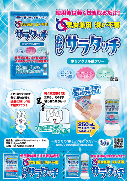 トップページ > ローション > ローション・潤滑ゼリー > 男女兼用 洗い不要!サラタッチ 使い切り8ml