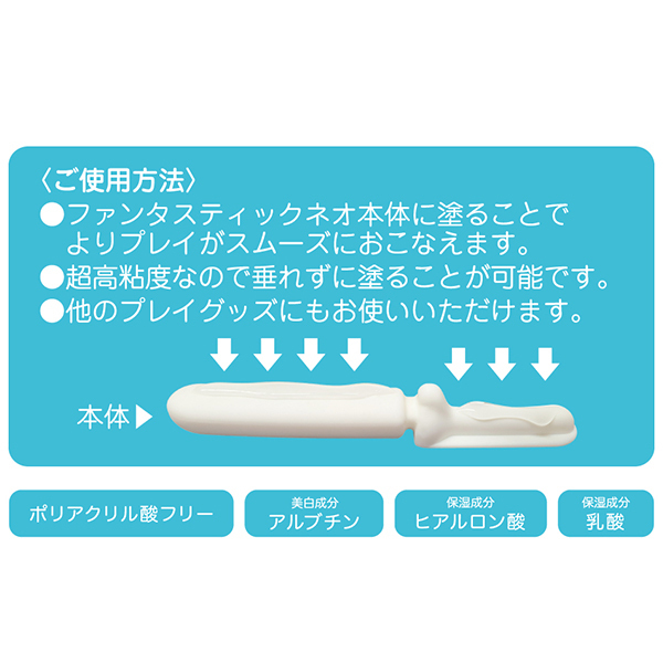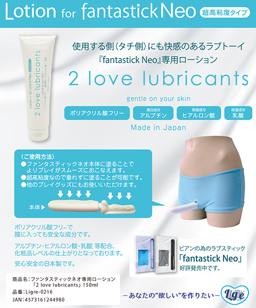 | レズビアン専用の超高粘度タイプのローション「2 love lubricants 150ml」です。 あの人気商品「ファンタスティックネオ専用ローションで、膣に入っても安全な化粧品レベルの安全性が特徴!チューブタイプなので適量を取り出しやすく、美白成分アルブチン、保湿成分ヒアルロン酸、乳酸が入った化粧品レベルの仕上がりとなっております♪歯磨き粉のような硬さ超高粘度!スティックに垂れる事なく塗る事ができて使いやすい♪ファンタスティックネオだけじゃなくバイブやローターなど他のグッズにもお使いいただけます。 |
