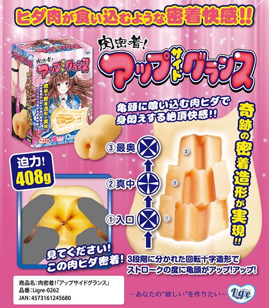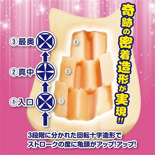 | 完全密着!肉密着!「アップサイドグランス」の登場です!見て下さい!この肉密着!ほとんど隙間がないぐらいの奇跡の造形!入り口から十字、そして徐々に回転していき角度が変わる!そこを押し込むように挿入していく。 軌道がずれて快感が変わる!常にヒダ肉が食い込んでいるような密着快感!抜き時にはカリの部分に十字の回転肉密着ヒダが食い込む!気持ち良すぎて、もう手が止まらない!ストロークが止まらない!3段階に分かれた回転十字造形は、その度に亀頭がアップアップ! |