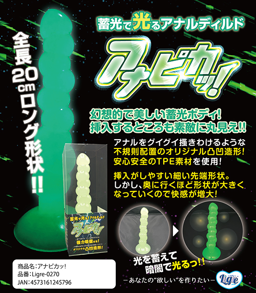 | 蓄光で光るアナルディルド「アナピカッ!」の登場です!アナルをグイグイとかき分けるような凸凹形状!素材はTPEなので人体にも安心安全です!暗闇でピカッと光るアナルディルド!とっても幻想的で美しい!挿入するところも素敵に丸見え!先端は挿入しやすい作りで、奥に行くほど球が大きくなる!この凸凹形状が最高に気持ち良いのです!さらに200mmのロング形状なので、挿入感も大満足の一品!アナピカッでアナルプレイを楽しもう! |