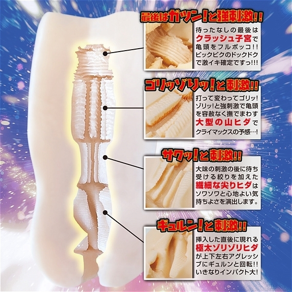 | まさに時空回転!極太のヒダが回転し、そして絞りにうねり、最後はクラッシュ!時空回転「スペースバンプス」の登場です!この造形!まさに無敵!超快感の極太ゾリゾリヒダが左右上下に回転!間に絞りを入れながらも細かい尖がりヒダで超ゾリゾリ体験!さらには亀頭を撫でまわすような山ヒダにゾリゾリ造形!待ったなしの最後はクラッシュ子宮で即イキ確定!こんな贅沢すぎるオナホが今まであっただろうか!?最初から最後まで快感が上り詰める!ピストン運動でアナタは宇宙を体験するだろう!これはオナホのブラックホールだ!! |