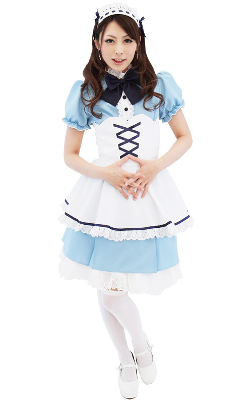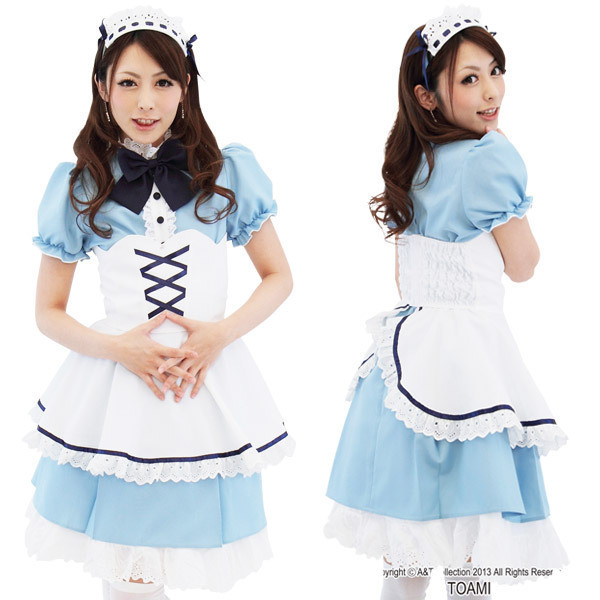 | 清楚な雰囲気たっぷり!サックスブルーが目に鮮やかなメイドコスプレ衣装。 エプロンのフロントに施したネイビーの編み上げリボンが、クラシックな雰囲気を演出。 ヘッドドレス調のカチューシャが気分を盛り上げるメイドコスチュームです。 ※ストッキングは付属しません |
