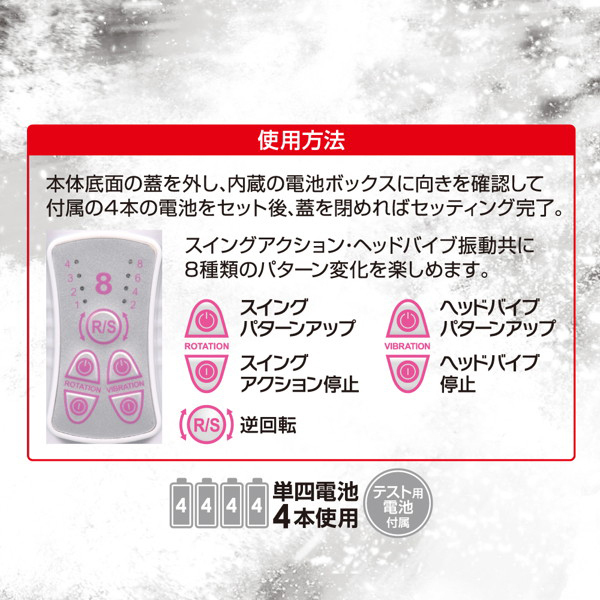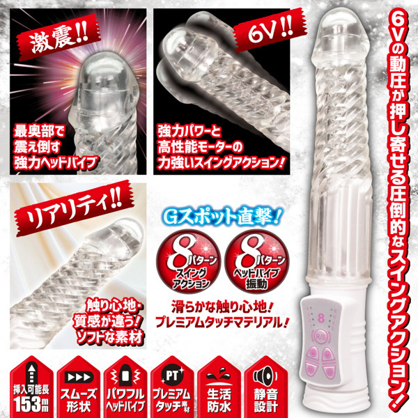 | 6Vの激震がGスポ直撃!中イキ派唸る悶絶必至の電池式バイブ(白)。 内蔵された高性能モーターが繰り出すハイパワー振動!8種類のスイングと振動パターンに加えて、刺激の変化をもたらすリバース機能で飽きの来ない多彩なアクションが楽しめる♪挿入可能長は153mm、滑らかで触り心地の良いプレミアムタッチ採用!最奥を徹底的に責め立てるストレートバイブ。 単4電池×4本使用 |