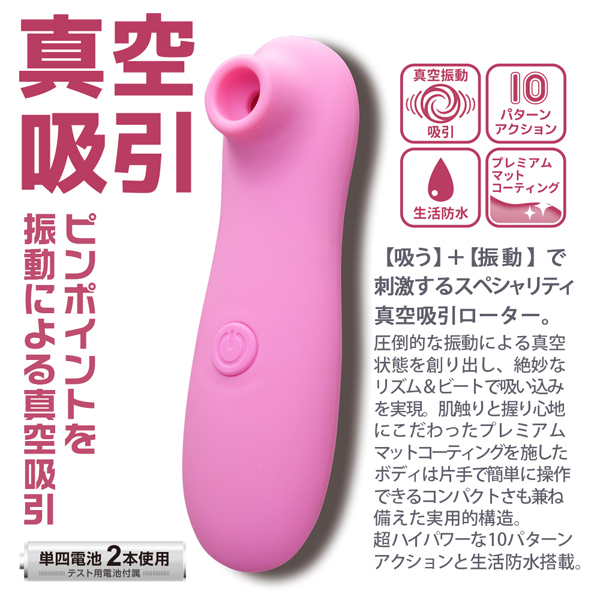 | 女性の敏感なポイントを真空吸引!バキューム×振動で刺激する電池式の吸引型ローター(ピンク)。 超強力10パターンのアクションを搭載!リズミカルな振動を加えて真空状態を作り出すことで女性の敏感な部分を強力バキューム♪肌触り良く握り心地も良いプレミアムマットコーティングを施した、持ち運びに便利なコンパクトサイズの吸引ローターです。 生活防水仕様、単4電池×2本を使用 |