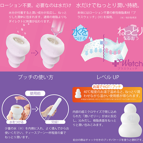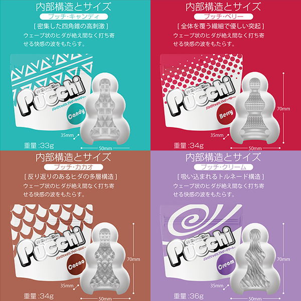 | 全てが新しくなったプッチ。 ポケットサイズのローション不要ホールプッチシリーズが生まれ変わって新登場。 軟性素材から内部の構造、パッケージ、全てが新しくなりました。 デコボコ感、さらにクッキリ。 今回新たに導入した「HD(High Definition)成形」で突起のデコボコ感がさらにクッキリになりました。 突起に触れたときの粒立ちが違います。 弾力感、さらにモッチリ。 「HD 成形」により軟性樹脂の弾力性も向上。 さらにモッチモチに、しなやかな素材になりました。 内部構造も、さらにハッキリ。 オリジナルシリーズ、スイーツシリーズ計8種類の内部構造をより精密な造形にリニューアル。 「HD 成形」とあいまってデコボコ感がよりハッキリわかる構造になりました。 生産工場を一新。 新型プッチシリーズは日本国内に新設した工場から生産。 最新の設備と厳密な品質管理で一つ一つ丁寧に作ります。 ローション不要、必要なのは水だけ。 ローション不要軟性素材「プラスウェッチ」水分が付着すると潤い成分が反応、ねっとりした潤いに包まれます。 <キャンディー内部構造>「密集した四角錐の高刺激」整然と敷き詰められた四角錘の突起<クリーム内部構造>「吸い込まれるトルネード構造」斜めに擦り上げてくるヒダはクリームのように昇りつめる絶頂感<ベリー内部構造>「全体を覆う繊細で優しい突起」フワフワとした起毛が包み込みまったりしたなめらかな触感<カカオ内部構造>「反り返りのあるヒダの多層構造」ビッシリ並んだヒダは反発しながら複雑に絡みつく刺激 |