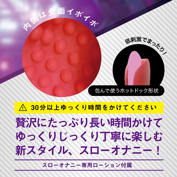 | 時間を掛けて限界を超える。 スローオナニー専用オナホール「ズリセン」!あなたは、「スローオナニー」という言葉を知っていますか?贅沢にたっぷり長い時間をかけて、ゆっくりじっくり丁寧にプレイを楽しむ、それがスローオナニー。 「ズリセン」は、そんな新しいプレイスタイルのために生まれたオナホールです。 挟み込むホットドッグ形状と、まったり刺激とで、スローオナニーをサポートします。 貴男をパックリと挟んで包むホットドッグのパンズような形状が特徴的です。 通常のオナホールにある挿入行為が不要で挟むんでコスるだけで楽しめるのでビンビン状態でなくても使用可能。 半ビン状態から優しいアプローチで、ゆっくりと気分を高めることが出来るのです。 長い時間を楽しめるよう、まったりとした刺激も特徴的。 最初は優しくスリスリ、盛り上がってきたら裏をズルズル、さらに高まってきたら頭をグリグリとまるで磨き上げるようにじっくり楽しめます。 焦らすようにジワジワと快感を貯め込むことでフィニッシュ快感は遥かな高みに到達するはず。 すぐにフィニッシュを求めず、そこに至るまでの刺激を楽しみ続け、より深い快感を目指す贅沢な流儀。 それが新しいスタイル、スローオナニーなのです。 強い刺激やビンビン持続も必要ないので、「早さ」や「タフさ」のトレーニングにも!?「イボ」は、大きなイボイボ突起がびっしり配置されたデコボコ快感。 弾力たっぷりな肉感素材。 クリアカラーに包まれたビビッドなレッドカラーが絶妙な高級感を演出。 手コキと相性ぴったりなツブツブのまったり刺激をお楽しみください。 |