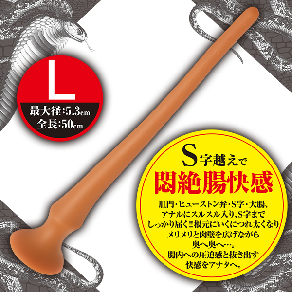 | 柔らかくて伸縮性のあるソフトシリコン素材を使った「ロングコロンスネークプラグ」です。 こちらはLサイズで太さはそれ程でもなく、全長50cmで最大径5.3cm!S字や大腸までしっかり届き、アナルにスルスルと入る仕様でエキスパートだけが味わえる気絶しそうなほどの悶絶快感もしっかりと味わえます♪根元にいくに連れてどんどん太くなるデザイン。 メリメリと肉壁を広げながら奥へと進み、腸内にディルドが収まり腹部がいっぱいになる感覚を堪能したり、抜き出す悶絶快感をお楽しみ頂けます♪腸内を傷つけない柔らかいリキッドシリコン製でモチモチとした滑らかな触感が気持ちいい!底部には吸盤もついているのでいろんな体勢で挿入プレイをお楽しみ頂けます! |