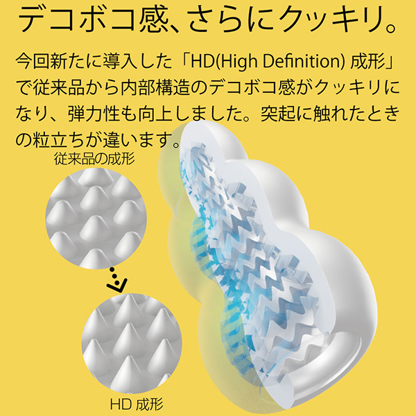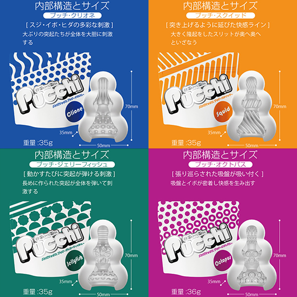 | 全てが新しくなったプッチ。 ポケットサイズのローション不要ホールプッチシリーズが生まれ変わって新登場。 軟性素材から内部の構造、パッケージ、全てが新しくなりました。 デコボコ感、さらにクッキリ。 今回新たに導入した「HD(High Definition)成形」で突起のデコボコ感がさらにクッキリになりました。 突起に触れたときの粒立ちが違います。 弾力感、さらにモッチリ。 「HD 成形」により軟性樹脂の弾力性も向上。 さらにモッチモチに、しなやかな素材になりました。 内部構造も、さらにハッキリ。 オリジナルシリーズ、スイーツシリーズ計8種類の内部構造をより精密な造形にリニューアル。 「HD 成形」とあいまってデコボコ感がよりハッキリわかる構造になりました。 生産工場を一新。 新型プッチシリーズは日本国内に新設した工場から生産。 最新の設備と厳密な品質管理で一つ一つ丁寧に作ります。 ローション不要、必要なのは水だけ。 ローション不要軟性素材「プラスウェッチ」水分が付着すると潤い成分が反応、ねっとりした潤いに包まれます。 <クリオネ内部構造>「スジ・イボ・ヒダの多彩な刺激」大ぶりの突起たちが全体を大胆に刺激する<ジェリーフィッシュ内部構造>「動かすたびに突起が弾ける刺激」長めに作られた突起が全体を弾いて刺激する<オクトパス内部構造>「張り巡らされた吸盤が吸い付く」吸盤とイボが密着し快感を生み出す<スクイッド内部構造>「突き上げるように延びた快感ライン」大きく隆起をしたスリットが奥へ奥へといざなう |