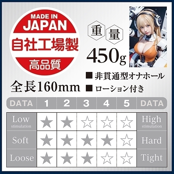 | 国内自社工場製の日本製。 「AIが考えた内部構造」+「下部二層」の極上名器。 AIが作る理想的なオナホールと理想的な女性イラスト、上は柔らか下は固めの「ソフト&ハードの片面二層」採用。 空間を敢えて広くする事でバキューム効果を発生させる設計。 弾力のあるフレキシブルスキン使用し高弾力・高伸縮、匂い控えめ。 |